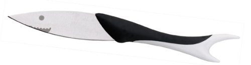The bright colors and whimsical postures of Animal House utensils turn any kitchen into a zoo. Kids especially enjoy helping out when they get to use a monkey vegetable peeler or toucan can opener. Requiring some adult supervision, this paring knife takes the shape of a shark, complete with an eye and mouth design on the pointed, shark-tooth-sharp, stainless-steel blade. A soft-grip, non-slip black-and-white handle fluidly forms the rest of the shark's body, minus the upright fin. Measuring nine inches in overall length, the knife not only cuts up fruit and vegetables with ease, but can bring a smile during a harried day and makes a great gift along with other fun utensils from the Animal House menagerie. After use, the knife is best washed by hand.