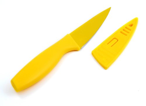 This 3-1/2-inch Yellow Paring Knife is for small cutting jobs and the peeling of vegetables or fruit. Matching sheath helps keep blade sharp and protects fingers while in storage. The handle is lightweight and ergonomically contoured for a comfortable, fatigue-reducing grip. Non-stick resin coating on the blade is made by bonding a food-safe FDA approved resin to stainless steel blade. It resists corrosion, makes cleaning simple, and helps blade glide through food with ease. 30-Year warranty.